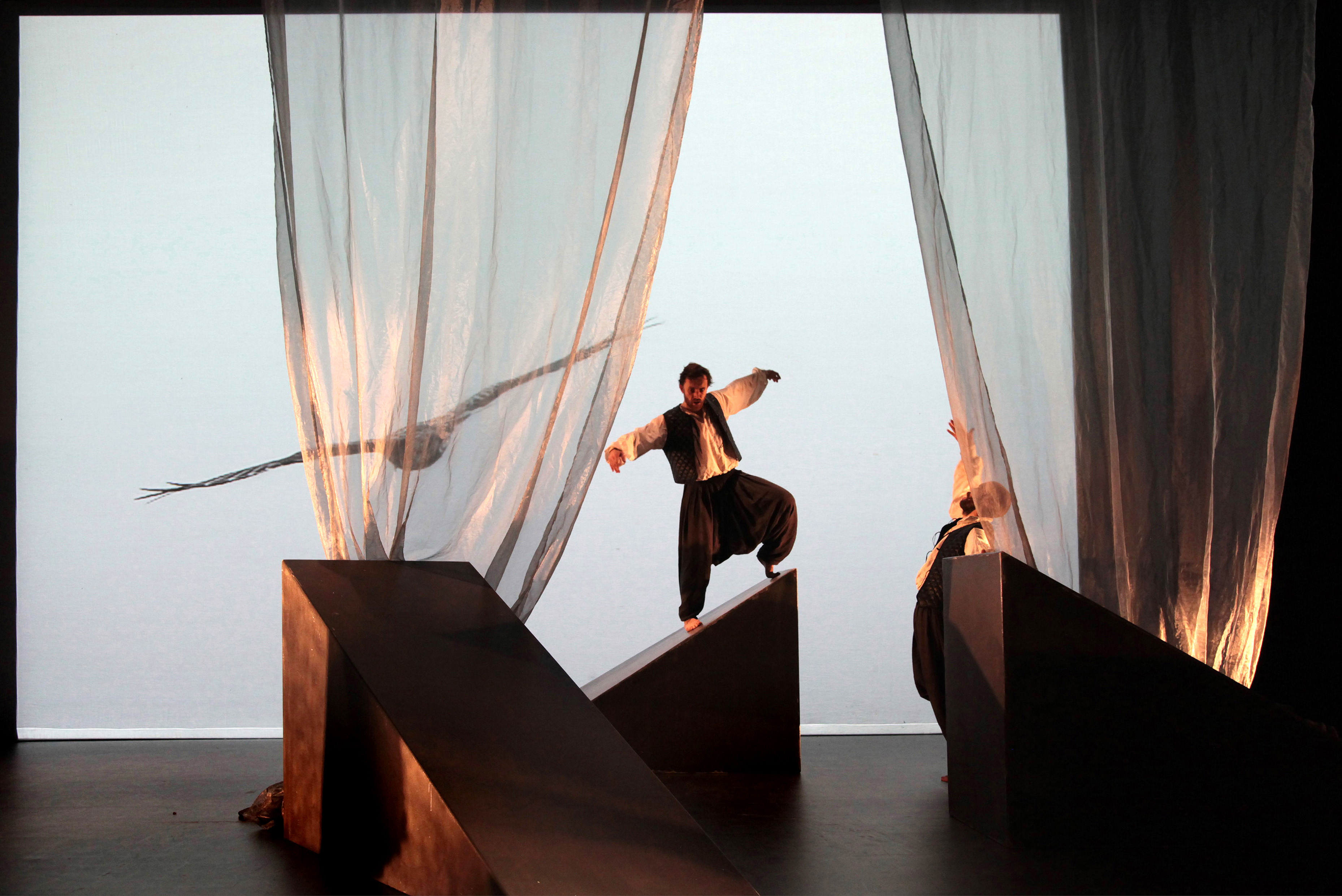 De Oscuro’s Mac//Beth is a dark and brooding piece of dance, brimming with stunning visual scenes, and well-placed in the intimate space of the Royal Opera House: Linbury Studio Theatre. Choreographer and Director, Judith Roberts’ piece opens in a filmic fashion: projections on the back wall set the scene and announce the title in fiery letters as live music from the Elysian Quartet ramps up the tension. In a moment of hush, the three witches appear. As they undergo a ritual de-robing, they shed warm layers, their faces appearing from under shadowy hoods. The three pile up their clothing and methodically set them aside, as if to say it’s time to begin…